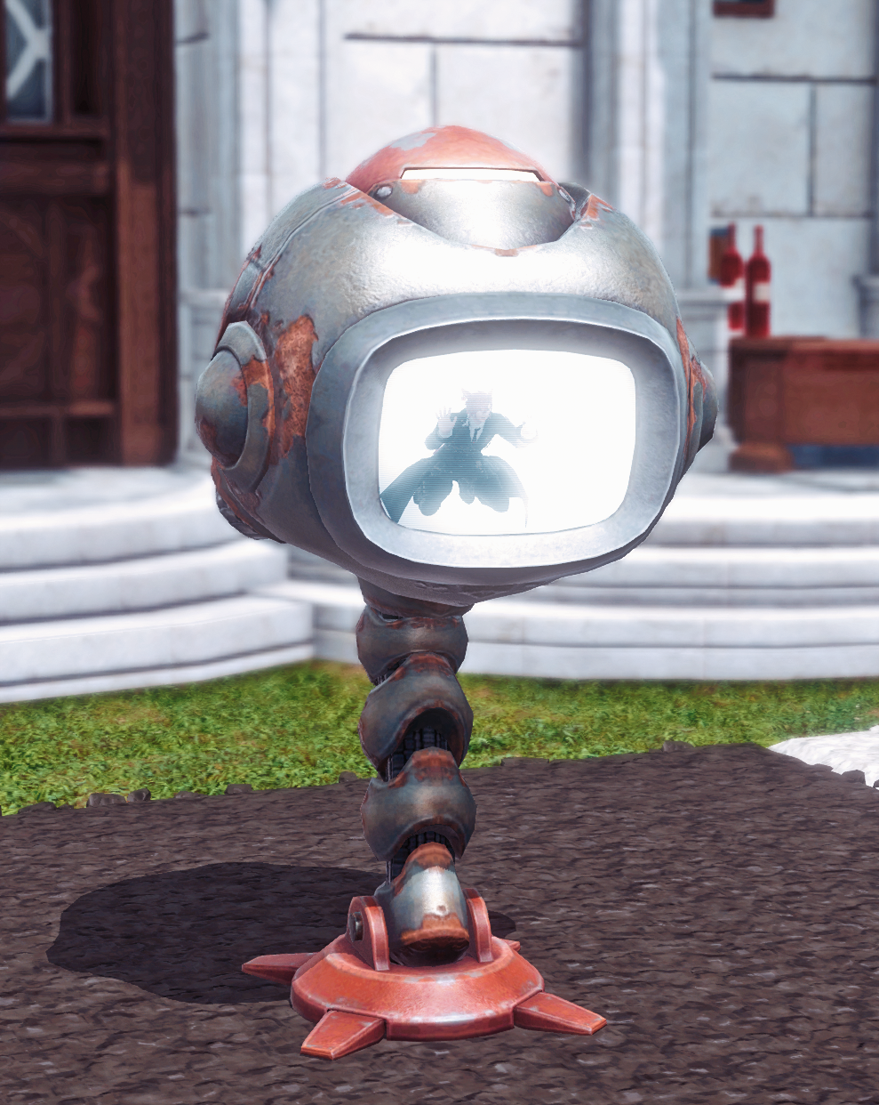 울티마 툴레의 Lv.90 나무인형은 레벨 측정기의 모양을 띄고 있는데, 탈것과 크기를 비교해 본 모습. 나무인형은 녹슬지 않은 멀끔한 외형인데, 탈것도 녹슬지 않은 버전으로 내어주지🤨.주위에 사람이 없는 틈을 타 나무인형인 척(?) 해보기.