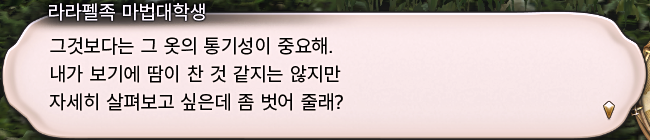 다시 라라펠족 마법대학생이 있는 곳으로 돌아가 배송 완료 보고를 하면 옷의 상태를 살펴보고 싶다며 벗어달라고 한다.