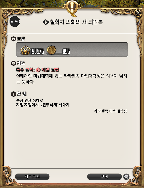 저 말이 끝나면 변신은 풀리고, 다시 마법대학으로 이동한 라라펠족 마법대학생에게 말을 걸면 퀘스트는 최종 완료된다.