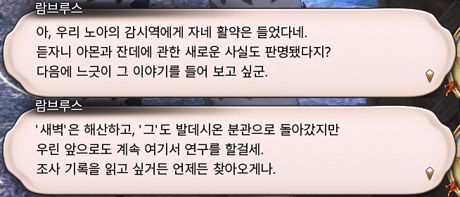 v5.3 메인 퀘스트를 완료하고 람브루스를 찾아가면 기존에 없던 선택지가 생기고 새로운 대화를 나눌 수 있는데,